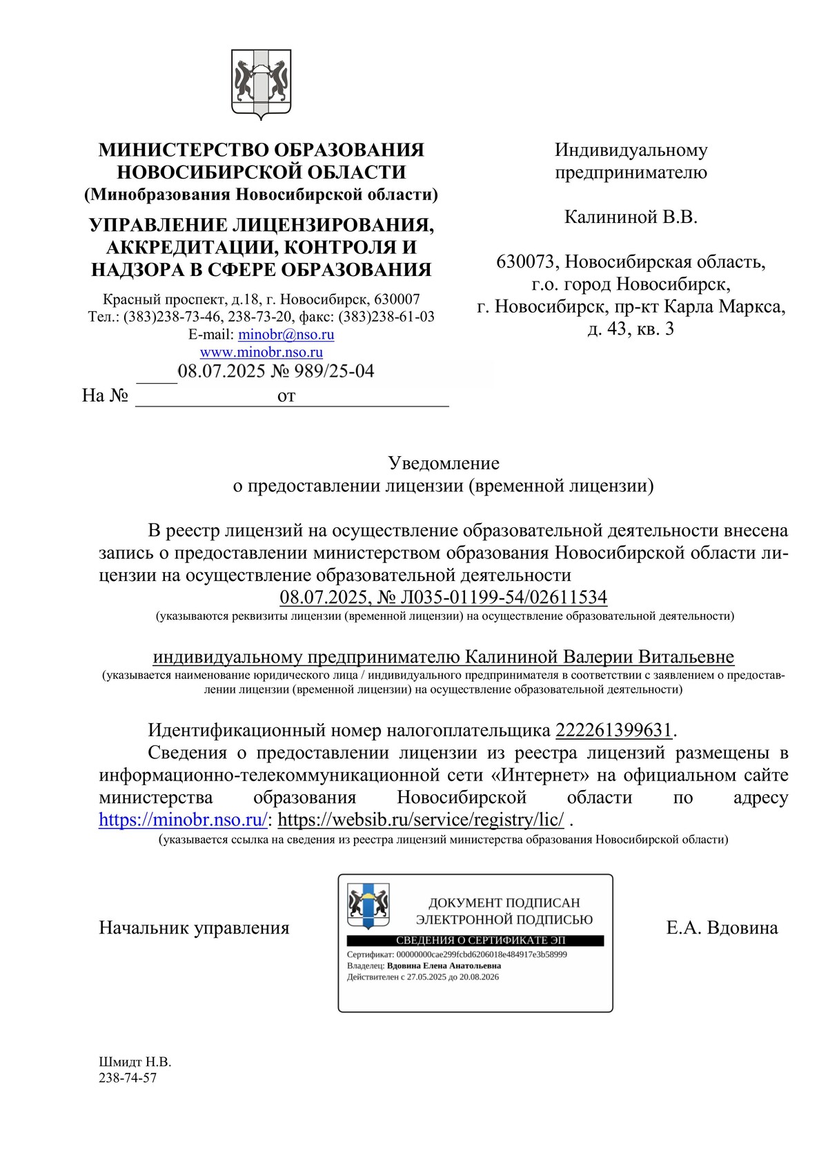8 июля 2025 года мы получили лицензию на осуществление образовательной деятельности № Л035-01199-54/02611534, выданную Министерством образования Новосибирской области.